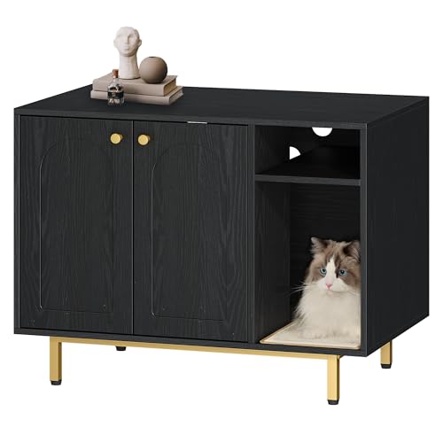 Hzuaneri Cat Litter Box Enclosure, Hidden Litter Box Furniture with Scratching Mat, Wooden Pet House Side End Table, Tall Legs, Double Doors, 80 x 50 x 61 cm, Black and Gold CB01504G