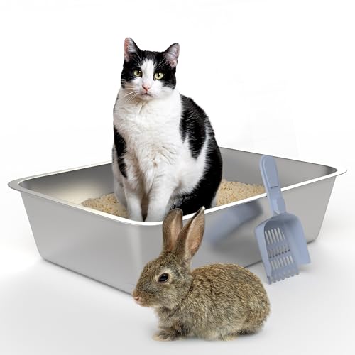 Stainless Steel Cat Litter Tray Box, Large High Sided Litter Box for All Cats Rabbits, Never Absorbs Odors, Non Stick Surface, Anti-slip Rubber Bottom, Easy to Clean, 50(L) x35(W) x 15(H) cm