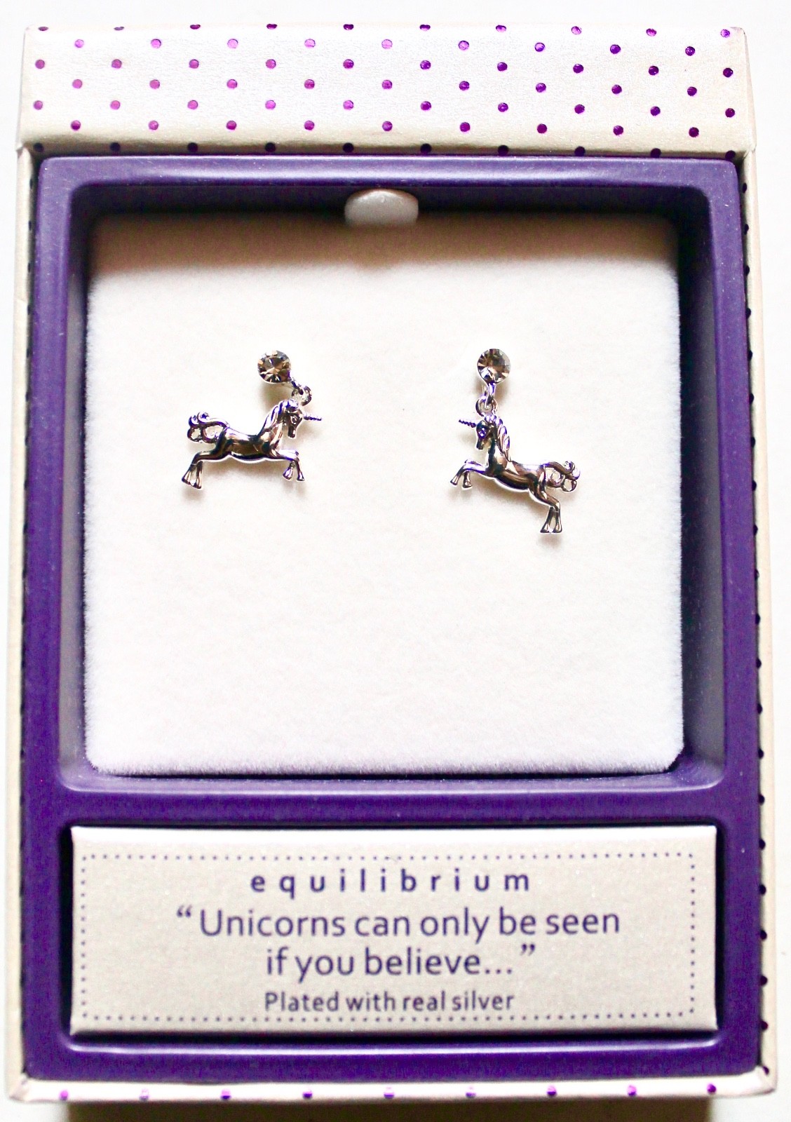 Unicorn silver plated earrings in gift box, for pierced ears, Valentines Day