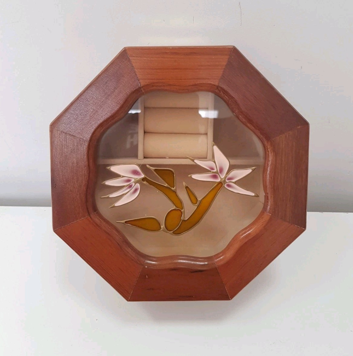 Vintage Tiffany Glass Octagonal Jewellery Box Polish Wood 17cm x 6.5cm Rings New