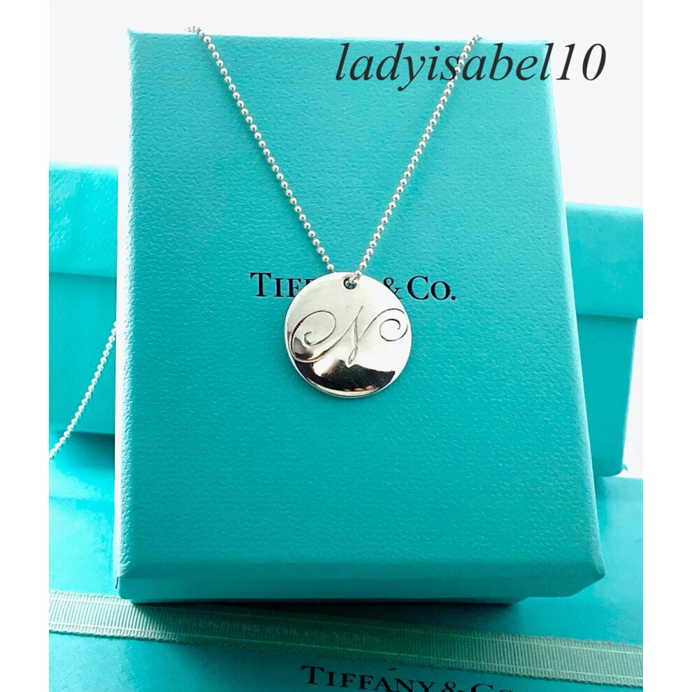 Tiffany & Co 18" Letter N Initial Lg Disc Pendant Beaded Silver Necklace w/ Box