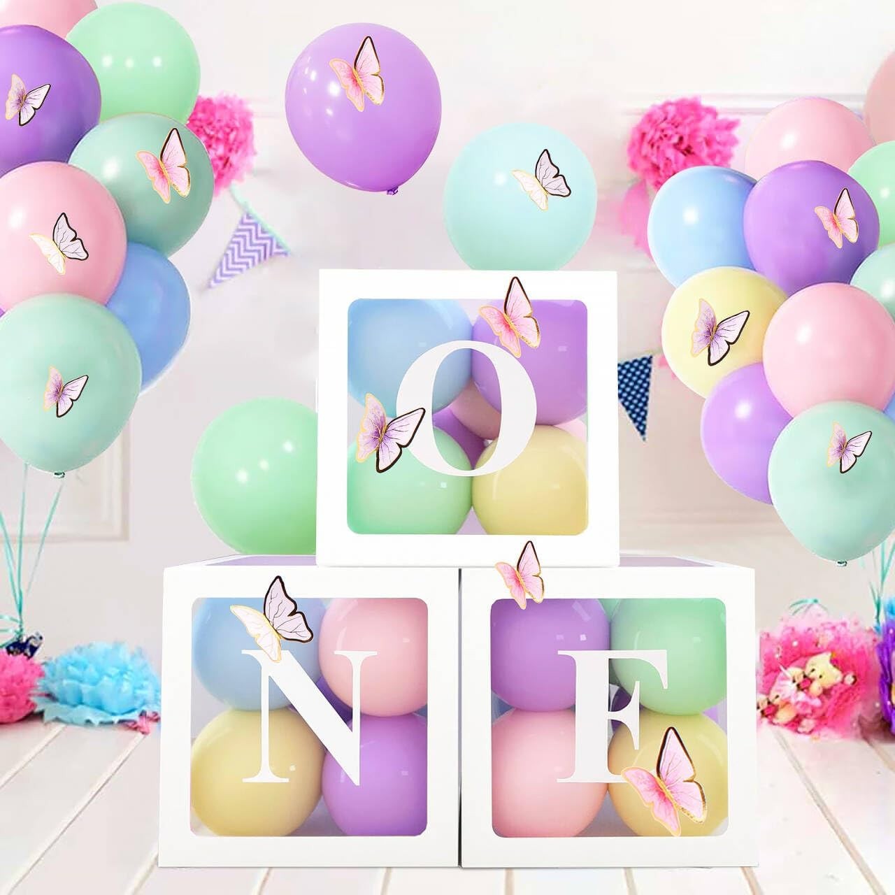 3Pcs Balloon Boxes 1st Birthday Decorations for Girls, Box With ONE Letters and Pastel Balloons, Butterfly Decorations for Baby Shower and First Birthday