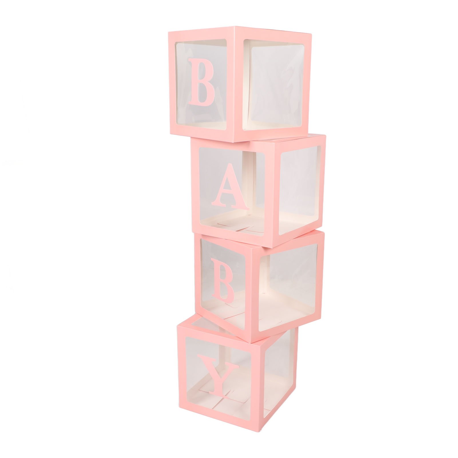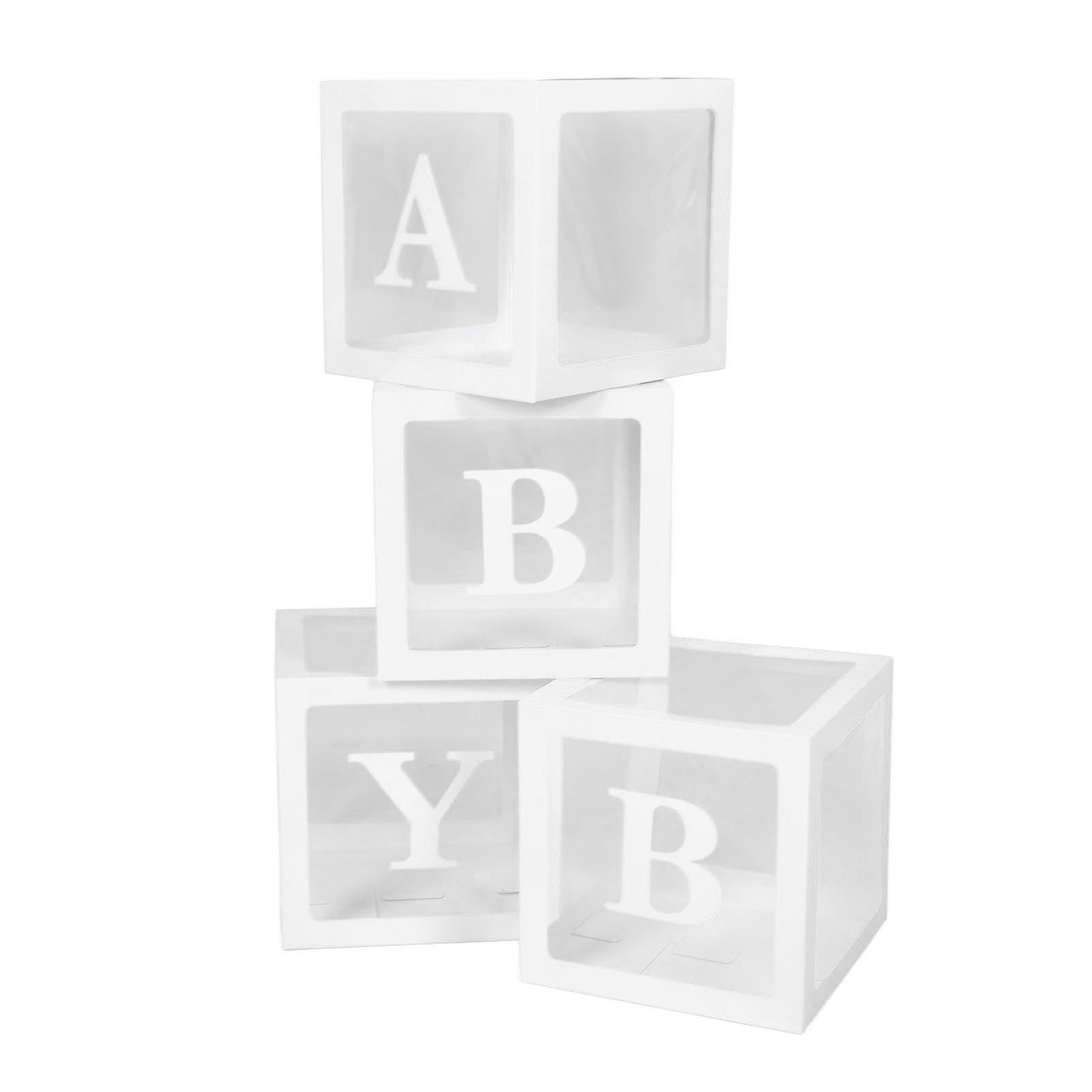 QIFU 4Pcs Baby Shower Balloon Box with 27 Letters for Boy Girl Birthday, 4 Transparent Balloon Boxes Block with Letter B+A-Z 25cm Custom NAME Box for Birthday Party Decor, Christening, Prom Decoration