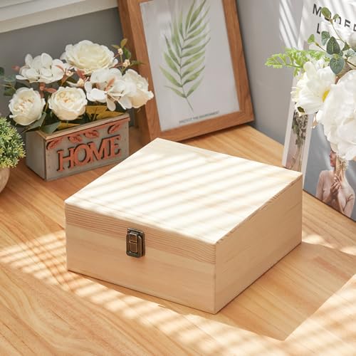 Warmiehomy Small Wooden Box with Lid 22.5 x 22.5 x 10cm Unpainted Plain DIY Handmade Wooden Storage Box for Photo Letters Stamps Gift Jewelry Treasure Memory Keepsake