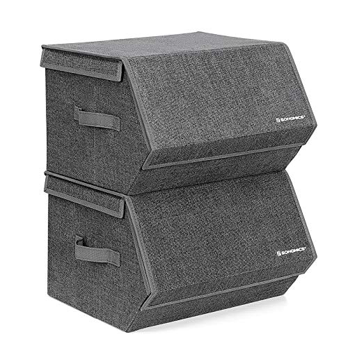 SONGMICS Set of 2 Storage Boxes with Lid, Stackable Folding Fabric Boxes, Metal Frame and Side Handles, for Accessories, Toys, Clothing, Dark Grey RYLB02G