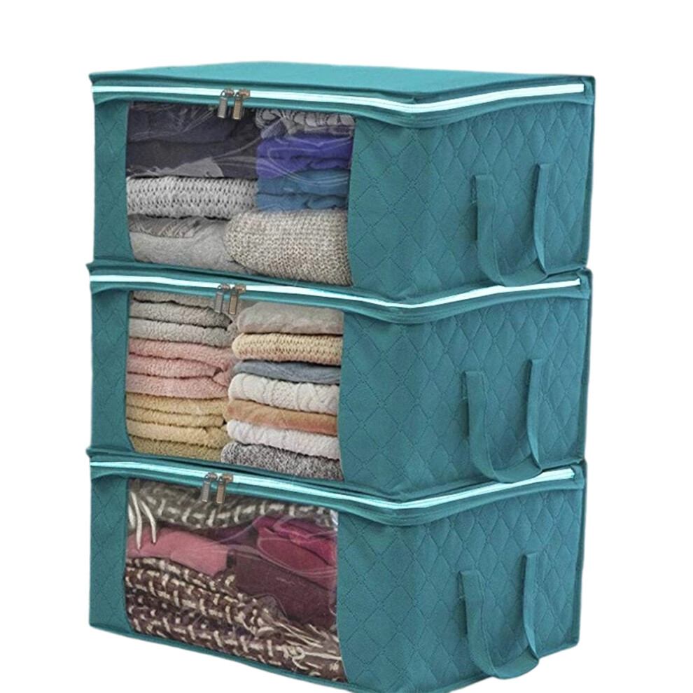 3-Pack Foldable Fabric Storage Boxes, Under-Bed Clothing Storage Bag with Zipper Closure for Clothes, Blankets, and More, 48 x 35 x 20 cm Blue