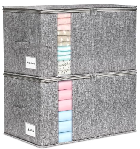 Luqeeg 4 Pack Clothes Storage Bins, Large Cotton Quilts Storage Boxes with Transparent Window, Foldable Closet Organizer Bags for Home and Travel, Clothing, Books, Grey 17 X 12 X 12