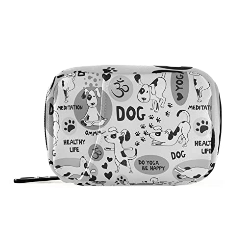 Cartoon Dog Yoga Health Vintage Style Black White Pill Case with Removable Internal Plastic Boxes Organizer, Small Medicine Bag Holder Zippered Carrier for Travel Storage Container