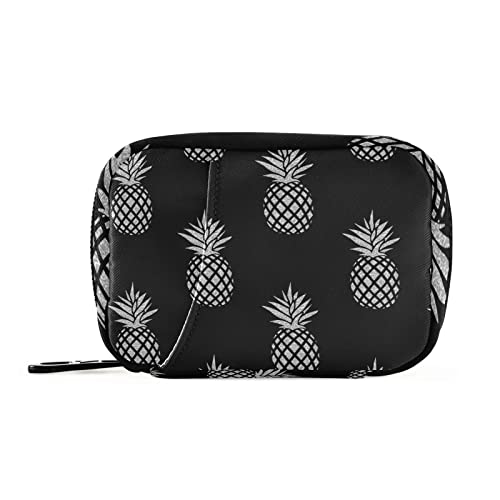 Silver Glitter Pineapples on Black Pill Case with Removable Internal Plastic Boxes Organizer, Small Medicine Bag Holder Zippered Carrier for Travel Storage Container