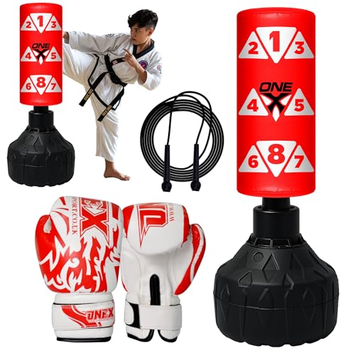 Free standing punch bag stand, Heavy Duty junior pedestal boxing bag dummy freestanding punching bag for kickboxing, MMA Martial Arts Training Fitness Equipment (RED WITH 6OZ)