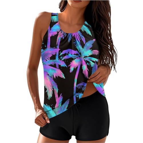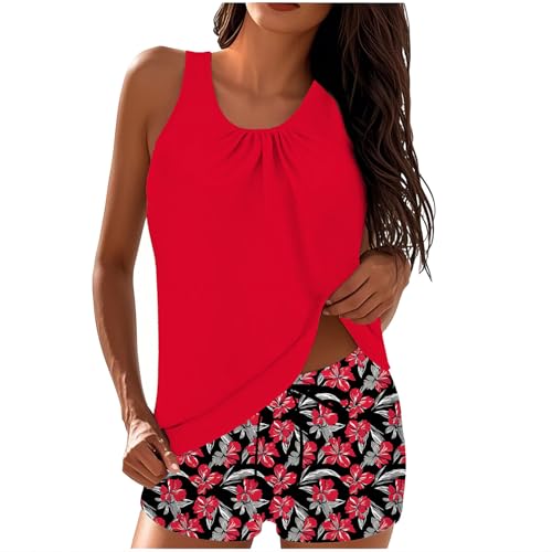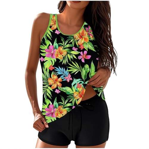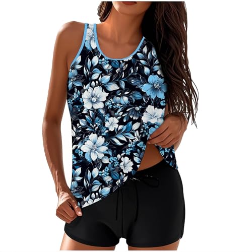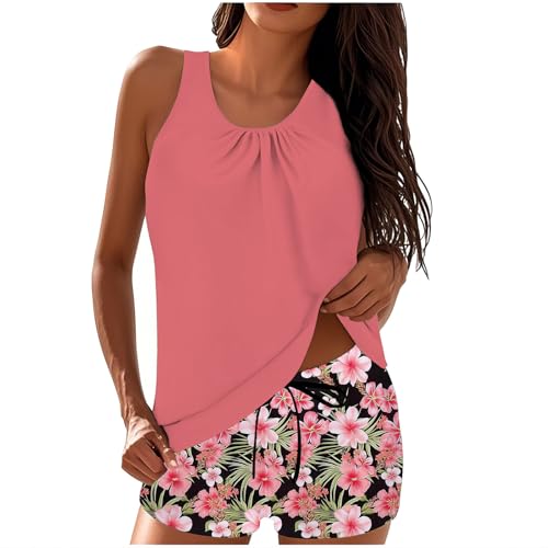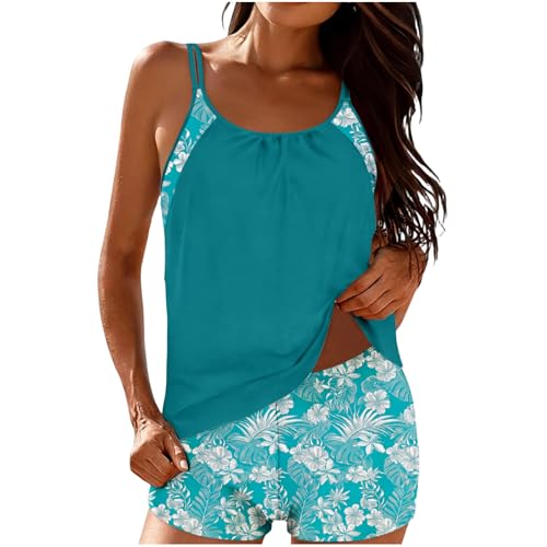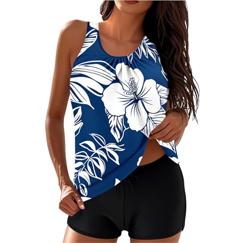 2 Piece Tankini Sets for Women Swimming Costume Floral Printed Tankini Top with Swim Trunks High Waist Boyleg Swimsuit Ladies Athletic Swimwear Set Tummy Control Bathing Suits Plus Size
