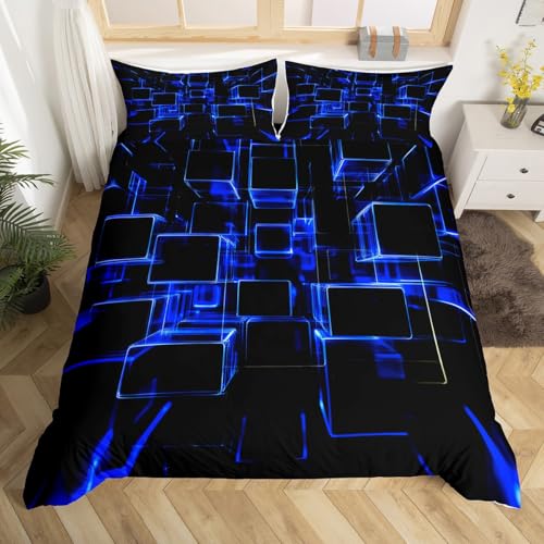 Honeycomb Blue And Black Kids Duvet Cover, Modern Geometric Square Bedding Sets For Boys Girls Gradient Neon Light Abstract Bed Set Double 3 Pieces, Zipper Closure