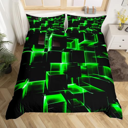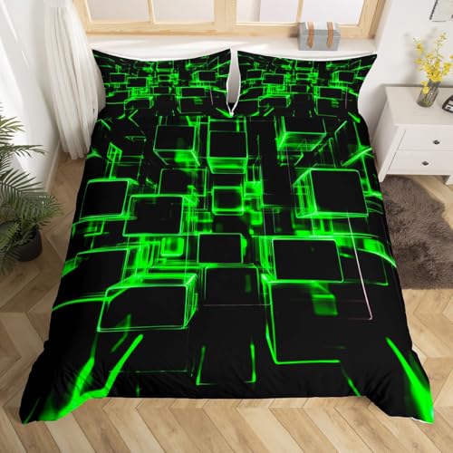 Honeycomb Bedding Sets Double, 3D Modern Abstract Square Grid Duvet Cover For Kids Girls Boys Green Neon Light Geometric Print Bed Set Bedroom Decor, 3 Pieces
