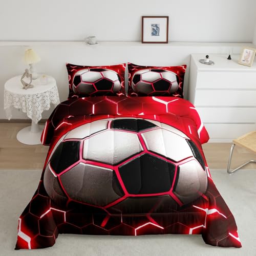 Erosebridal Football Bedding Comforter Sets for Boys Soccer Bedding Sets Full,Red Neon Light Decor Duvet Insert Modern Style Glowing Honeycomb Quilted Comforter 3Pcs,Sports Themed Bedroom Decor