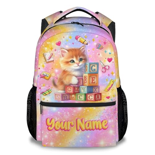GiftoFLUX Custom Kids Cat Backpack Personalised with Name, Back to School - Large Capacity 17 Inch Strong and Durable School Bag for Girls and Boys, Primary School, Everyday Use