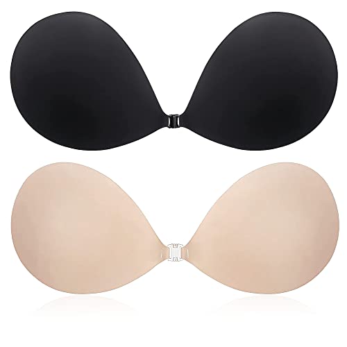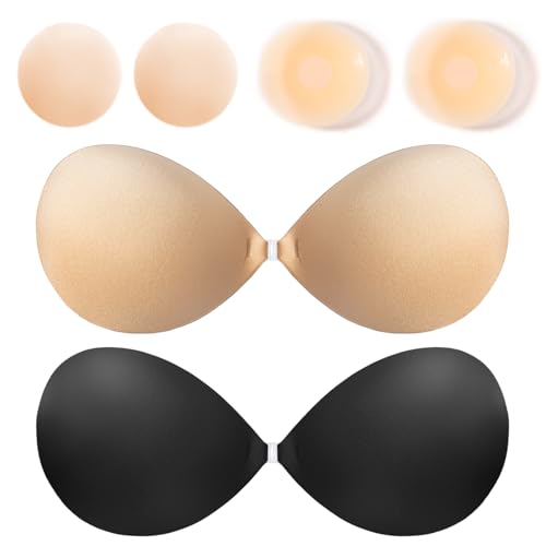 Sticky Bra Push Up, Invisible Bras for Women, Reusable Invisible Backless Strapless Bras Self-Adhesive Bra, 2 Pack Adhesive Bra for Strapless Backless Dress (Black+Beige)