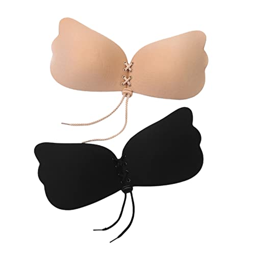 MIVAIUN 2 Pack Push Up Invisible Bra with Drawstring, Strapless Bras for Women, Adhesive Bra, B Cup, Beige and Black, Reusable Backless Bra, Comfortable and Breathable, for Party, Wedding (B Cup)
