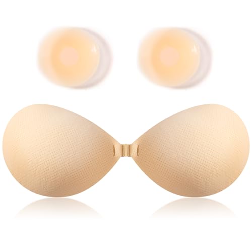 Bafully Invisible Adhesive Strapless Bra Sticky Push Up Silicone Bra with Nipple Covers for Women Backless Dress (L, Beige with 2 Nipple Covers)