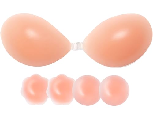 ANGELEMM Invisible Sticky Bra Push Up - Stick On Bras for Women, Reusable Women's Adhesive Bras, Strapless Backless Silicone Bra with 4 Nipple Covers for Party Dress (B Cup) Beige