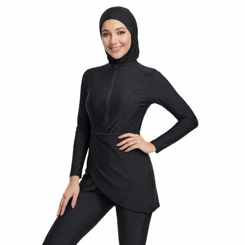 Odizli Burkini Swimwear for Ladies Muslim Swimming Costume Women Long Sleeve Ruffle Built-in Bra Top + Swim Leggings Pants + Hijab 3 Piece Full Body Modest Swimsuit Islamic Bathing Suit Black XL