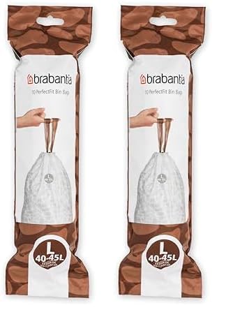 Brabantia PerfectFit Bin Liners (Size L/40-45 Litre) Thick Plastic Trash Bags with Tie Tape Drawstring Handles (10 Bags) (Pack of 2)
