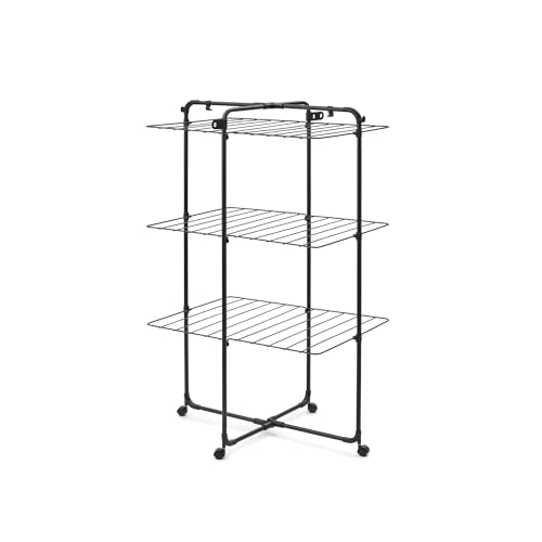 Brabantia HangOn Tower Drying Rack, 30m (Matt Black), Tall Foldable Clothes Rack, Space-Saving Laundry Drying Stand with Wheels and Hooks