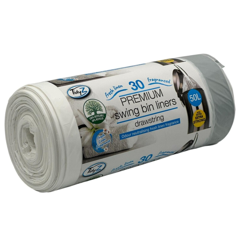 30 TidyZ Kitchen Bin Liners. Minimum 30% Recycled Plastic. Extra Strong Waste Bags. Fresh Linen Fragrance. Drawstring. Suitable for Brabantia and