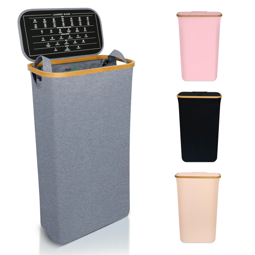 Nest Zest 60L Slim Laundry Basket with Lid, Washing Basket for Laundry, Hamper style Linen Bin with Care Guide & Removable Inner Bag, Dirty Clothes Bin with Sturdy Bamboo Rim and Oxford Fabric (Grey)