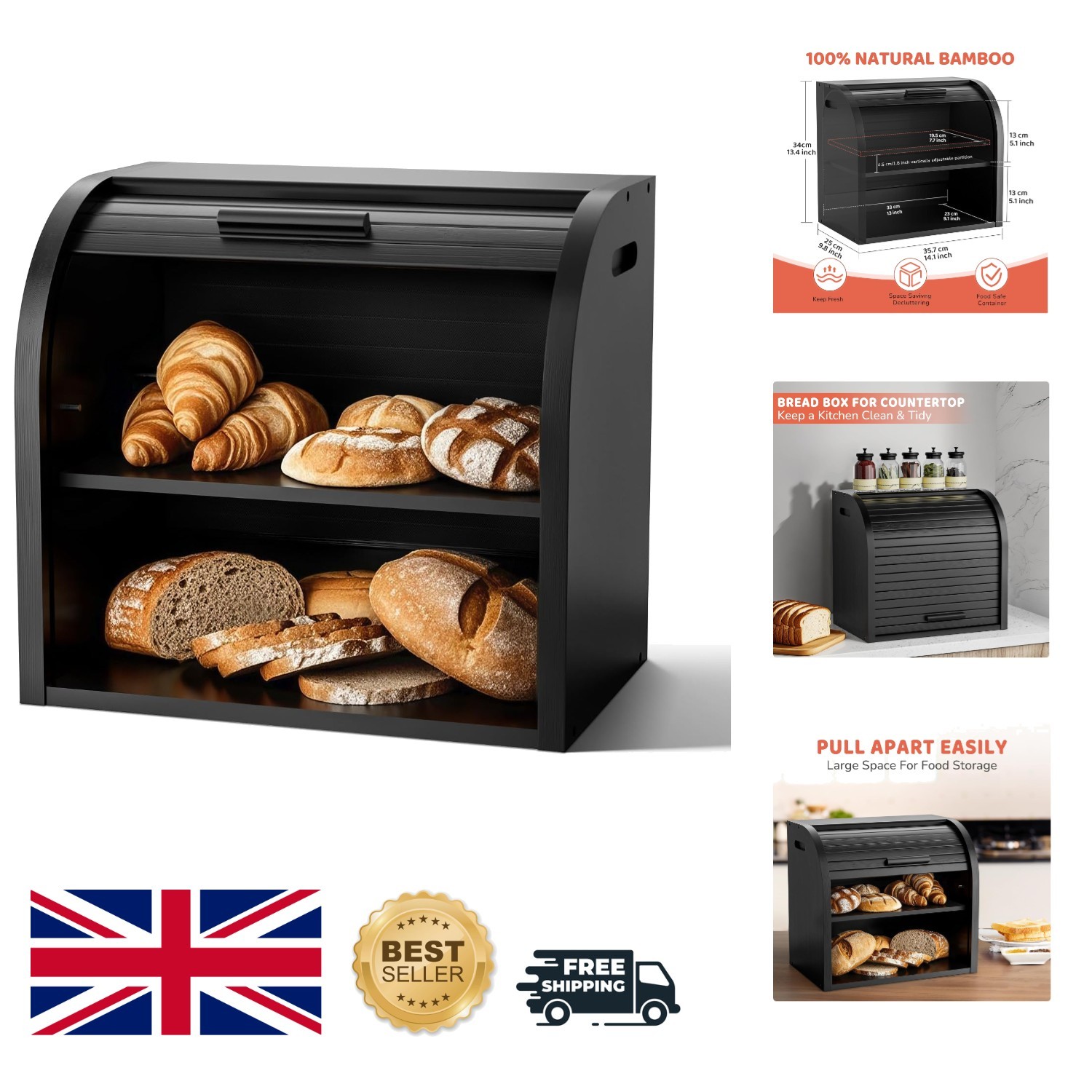 G.a HOMEFAVOR Bamboo Bread Bin 2-Layer Bread Box, Roll-Top Bread Storage for Kitchen with Removable Layer, Self Assembly, Black