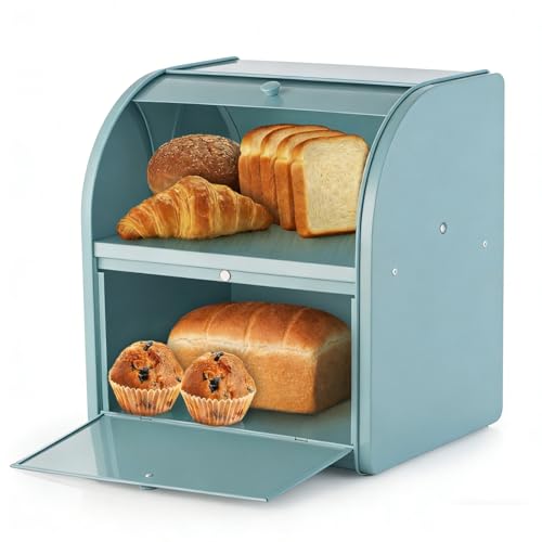 Osrioal Bread Bin, Double Bread Bins for Kitchen, Large Bread Bin with Roll Top Lid | Corner | 2 Tier | 35 x 25 x 33cm