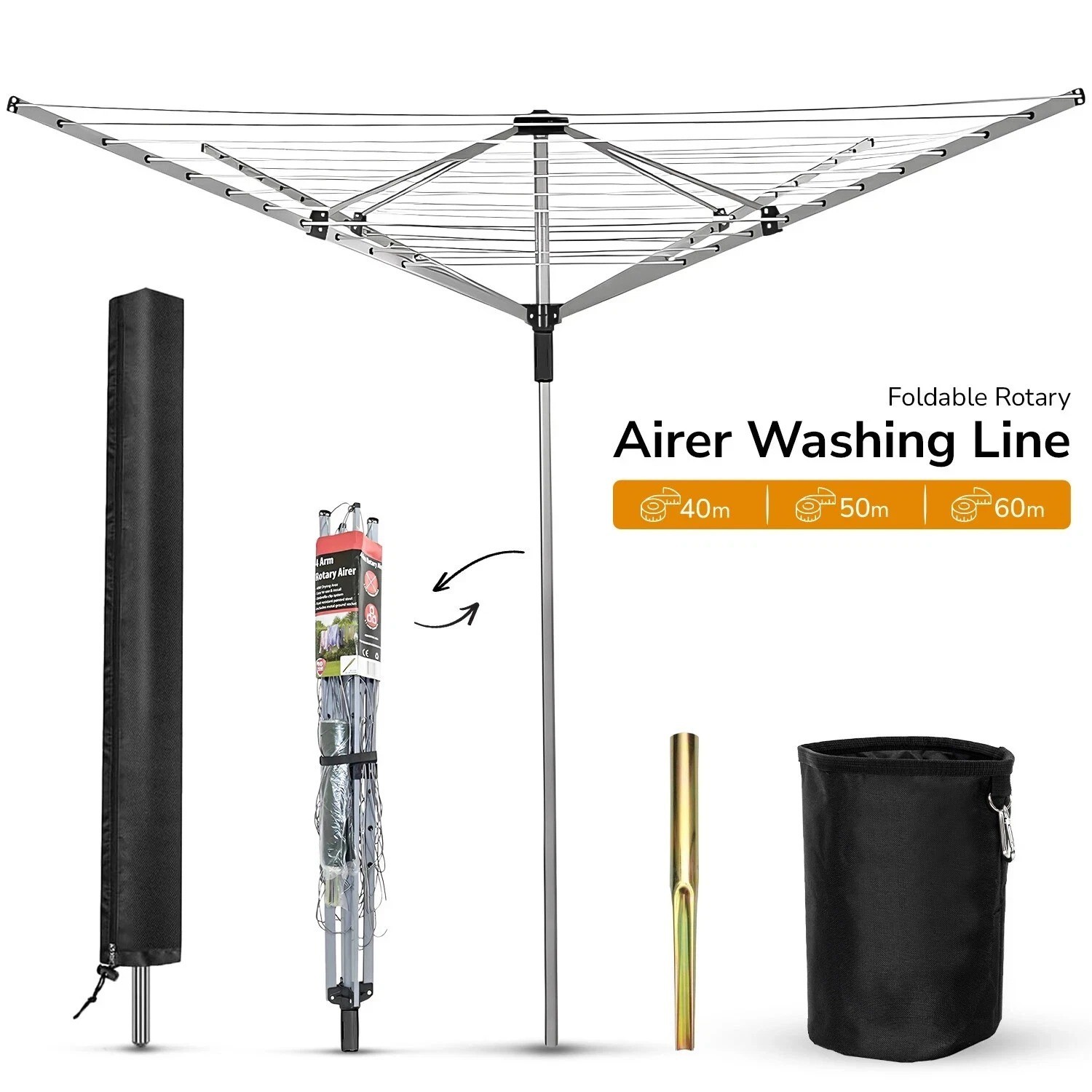 BPIL 60m Rotary Washing Line - Heavy Duty 4 Arm Outdoor Clothes Airer - 40/50/60M Portable Washing Line Dryer with Metal Ground Spike and Waterproof Protective Cover
