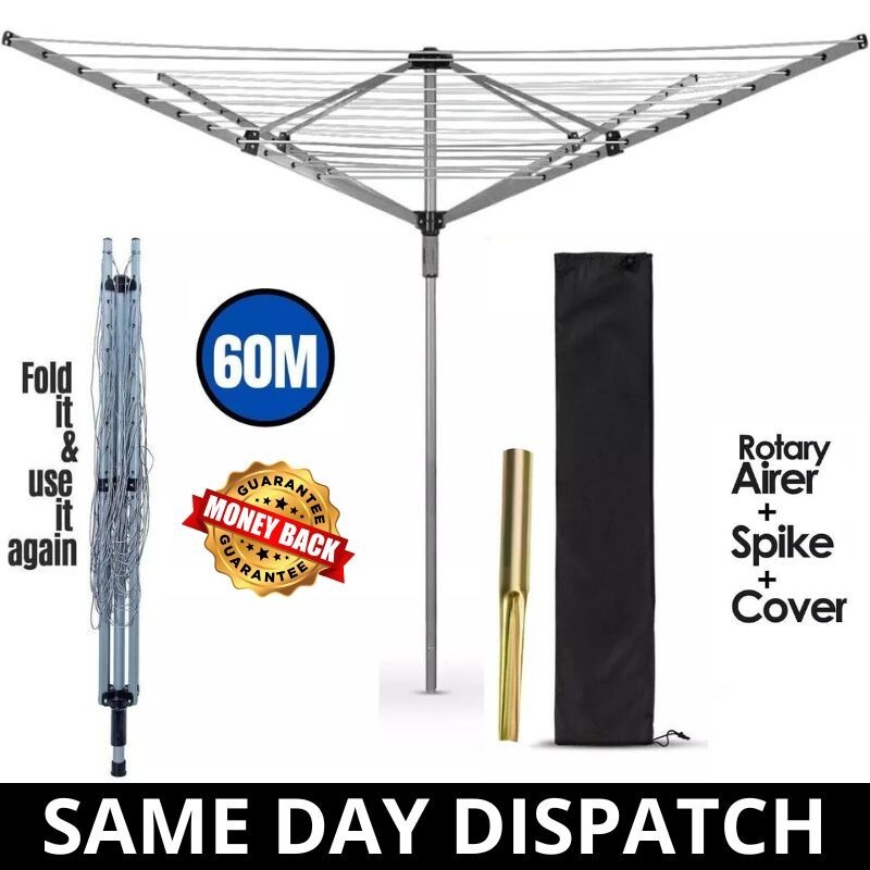 HeavyDuty 4 Arm Rotary Airer Outdoor 60M Washing Line Clothes Dryer Spike&Cover