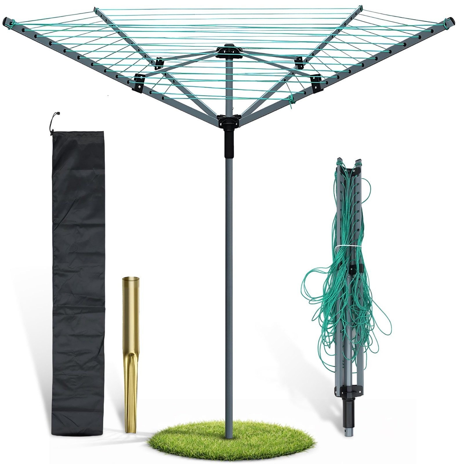 Heavy Duty Rotary Washing Line Outdoor, 4 Arm 60M Washing Line Rotary with Peg Bag, Metal Ground Spike, and Cover Included, Rotary Clothes Lines for Outside, Whirlygig Clothes Airer Outdoor (60 M)