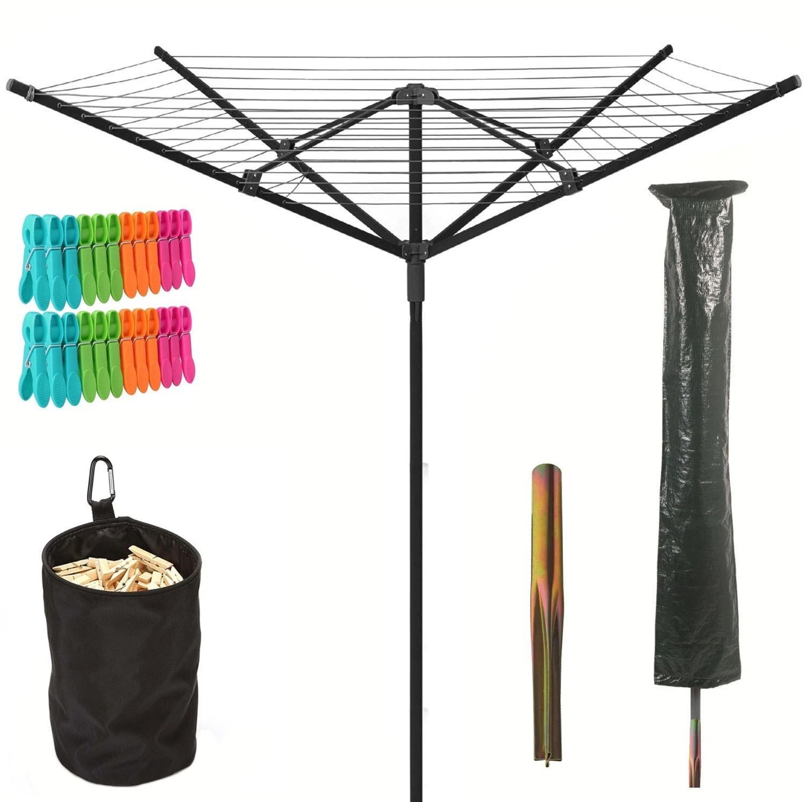 50m Black Garden 4 Arm Rotary Washing Line Clothes Dryer Airer Cover Spike Pegs