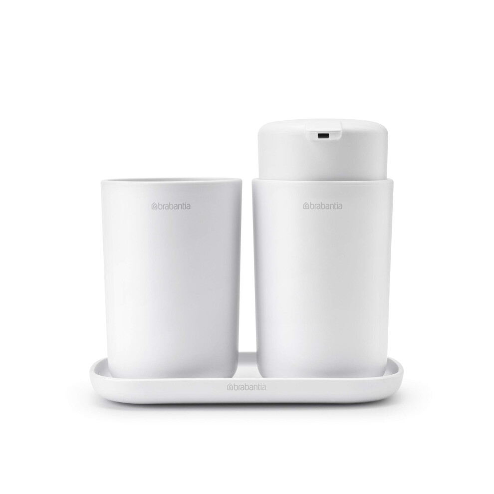 Brabantia ReNew 3 Piece Bathroom Accessory Set (White) Refillable Handwash Soap Dispenser, Toothbrush Holder & Tray
