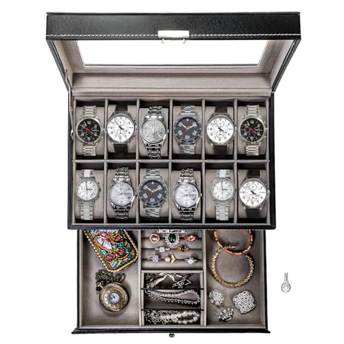 Tebery 12 Slot Watch Box Case Lockable with Glass Lid, 2 Layers Watch Holder Organizer Display with 1 Drawer for Rings and Bracelets, Gifts For Boyfriend Fathers Day Birthday (Black)