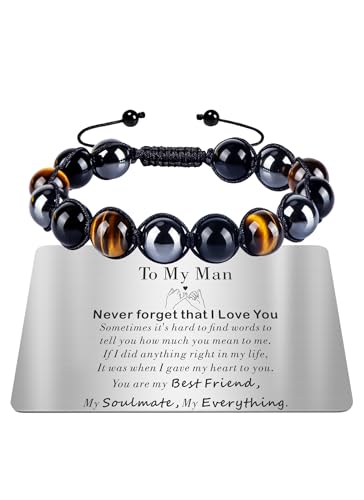 TOLOWOBK Mens Bracelets Gifts Tiger Eye Crystal Bracelet for Men Boys Personalised Triple Protection Hematite Beaded Bracelets for Men, Fathers Day Birthday Gifts for Him Man Dad Son Husband