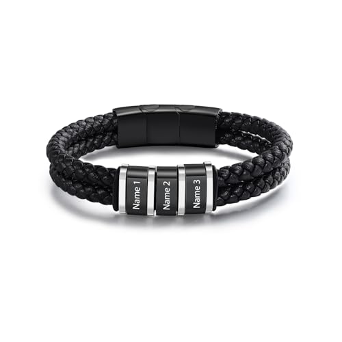 Personalised Bracelets for Men Custom Men's Name Bracelets Braid Leather Bracelet with 1-5 Names Engraved Personalised Gift for Men Dad Fathers Day Valentines (3 Names)