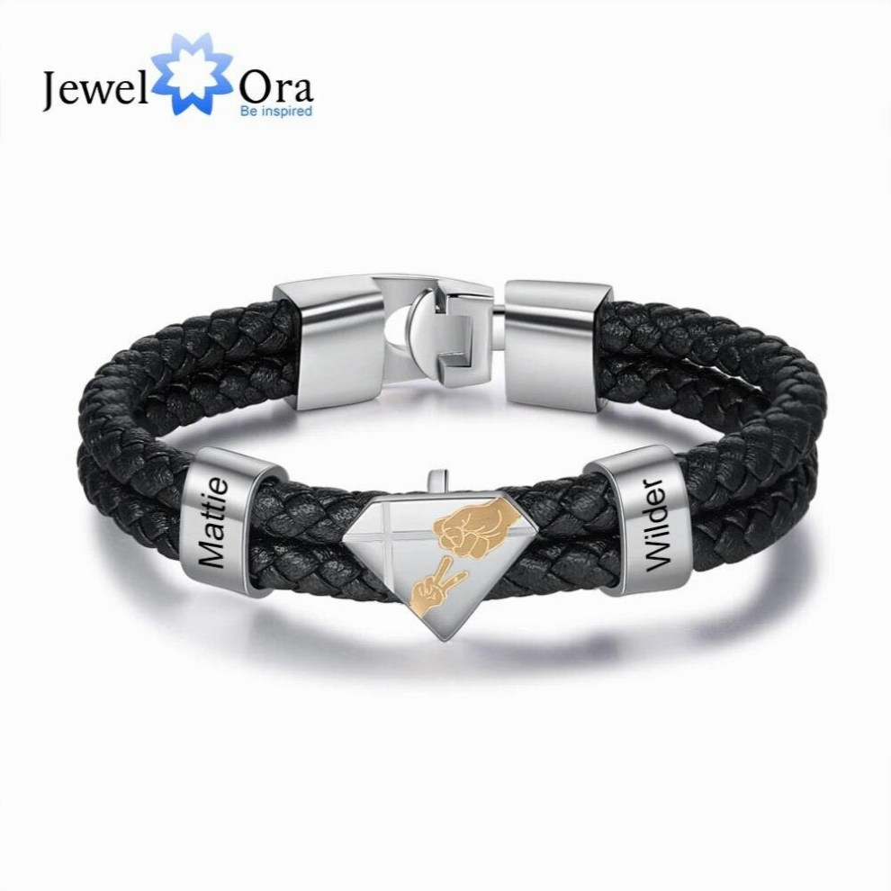 JewelOra Personalized Engraved Family Name Beads Bracelets Braided Leather Stainless Steel Bracelets for Men Fathers