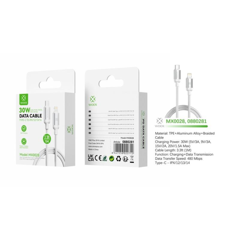 Woox MX0028 Type C to Lightning Braided Data Cable, 30W, 3.3ft 1m, White