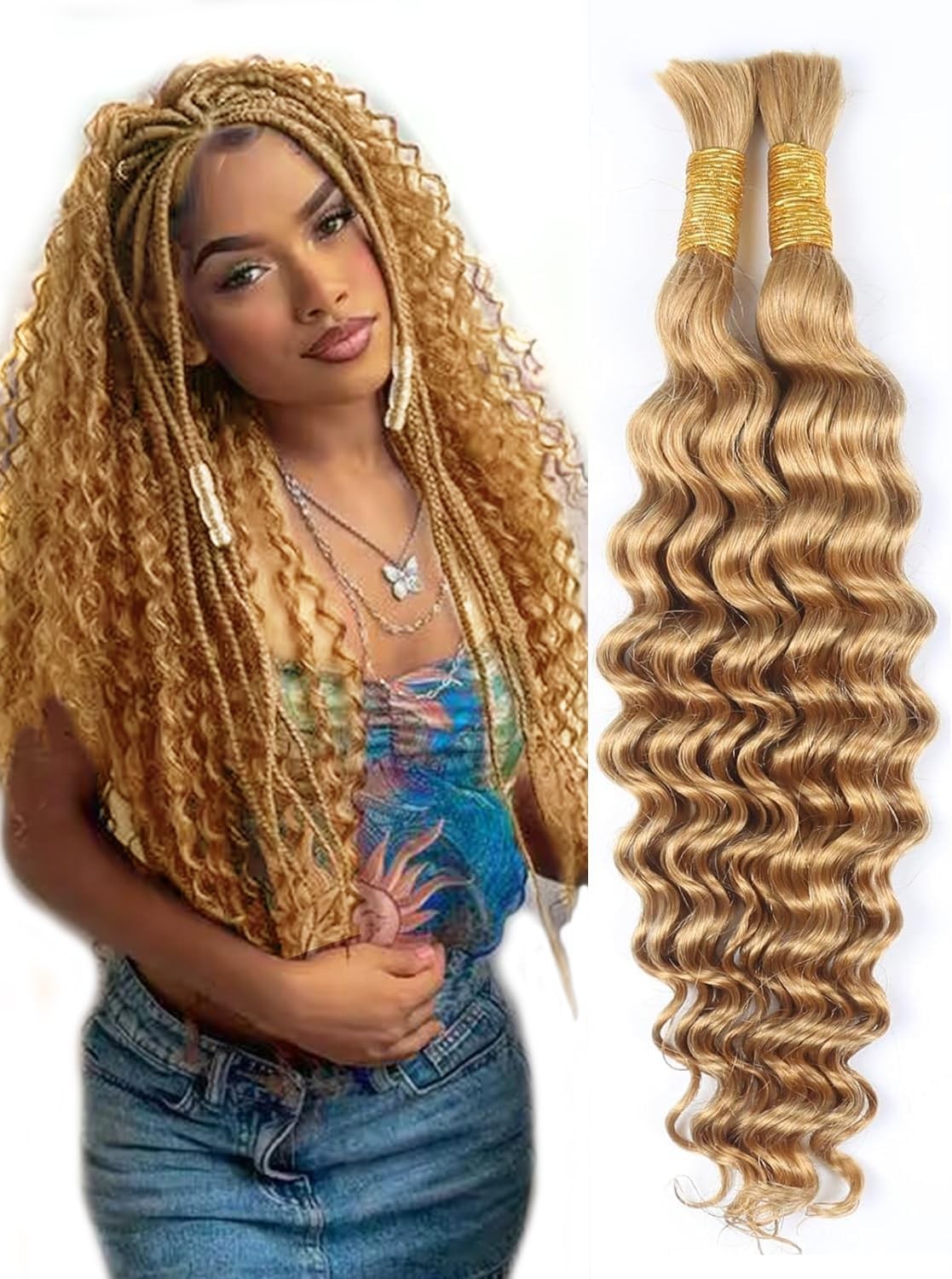 WOWANGEL Boho Braids Human Hair Extensions, Knotless Boho Braiding Hair for Curly Bohemian Styles,24 Inch Deep Wave Human Hair Bundles (100g),Honey Blonde(27#)