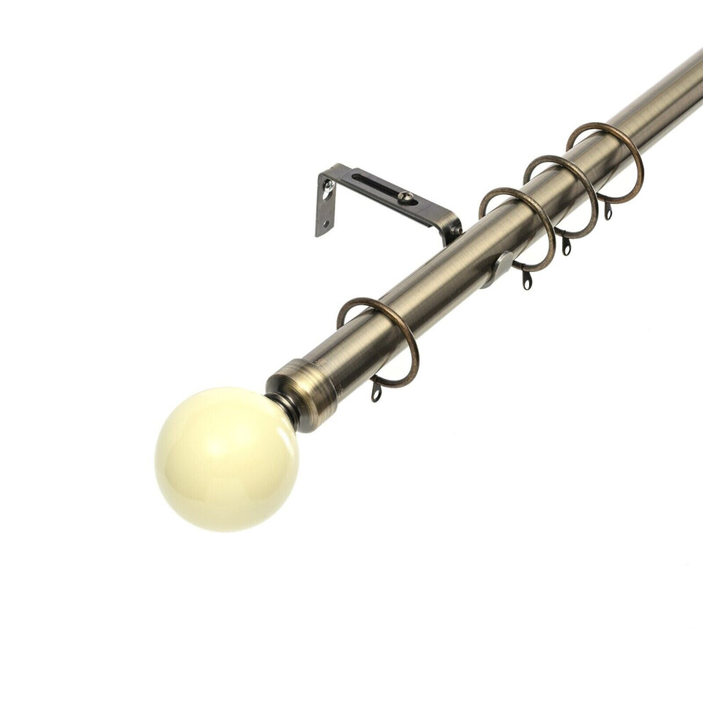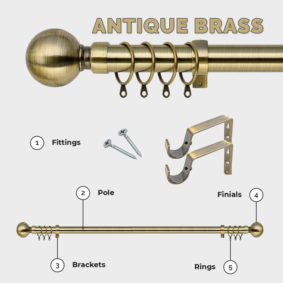 (Antique Brass - Plain Ball, 120-210 cm (48" -83" In)) Extendable Metal Curtain Poles 28mm With Rings Finials Fittings & Brackets