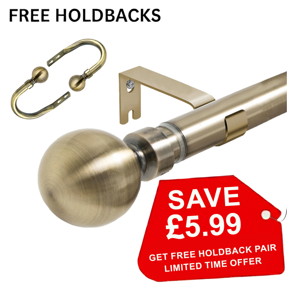 (Plain Ball Antique Brass, 120-210 cm (48" - 83" In).) Extendable Metal Curtain Poles Curtain Rods & Hold Backs Pair with Rings Finials & Rod Fittings