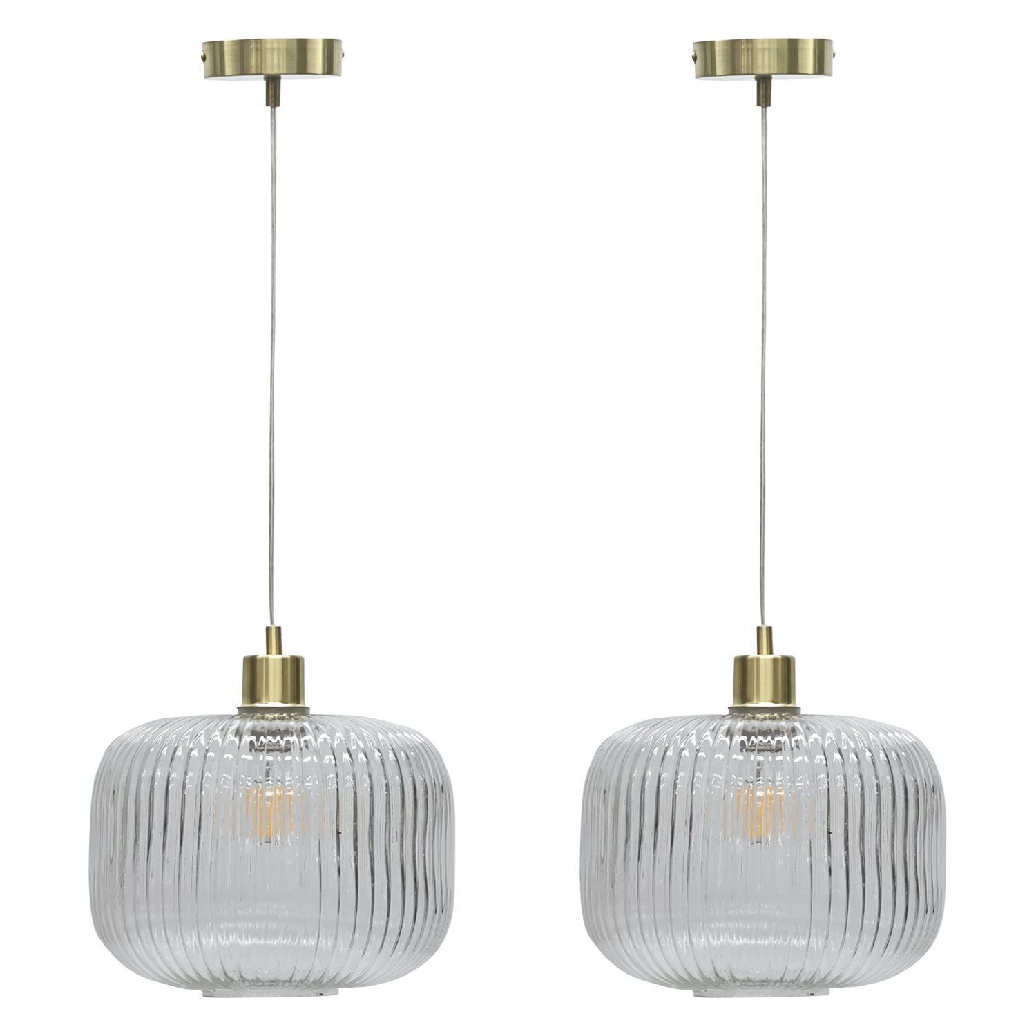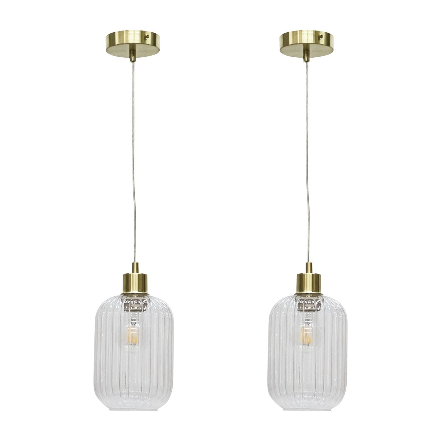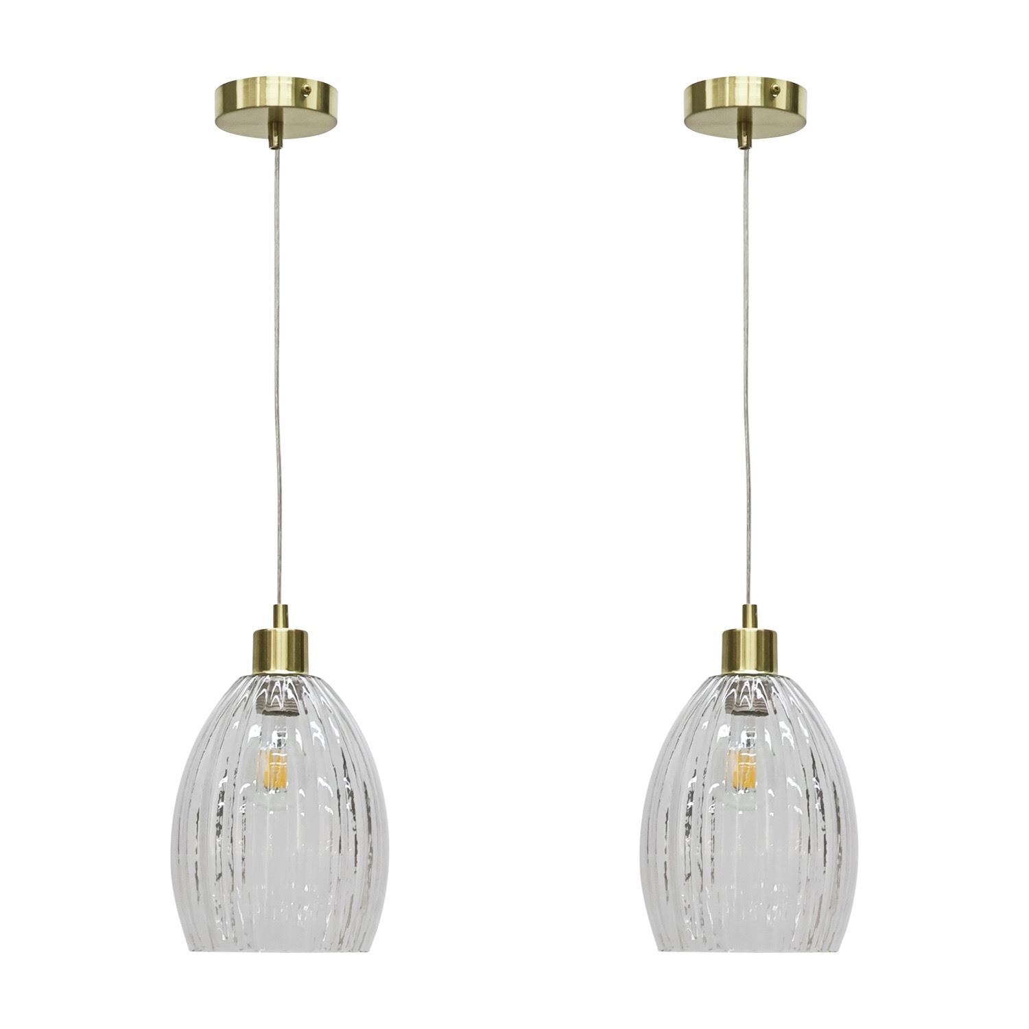 Set of 2 Ribbed Glass Satin Brass Ceiling Light Kitchen Dining Pendant Fittings