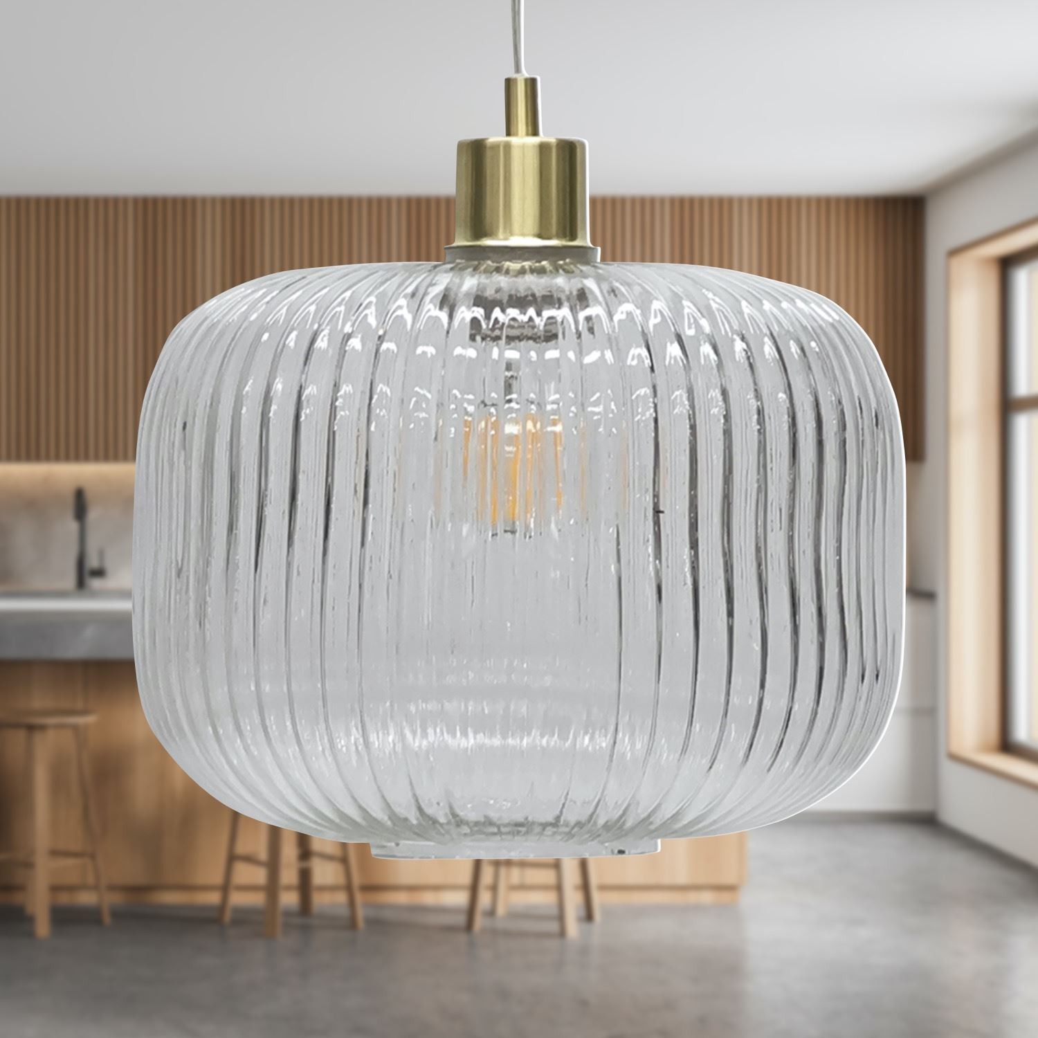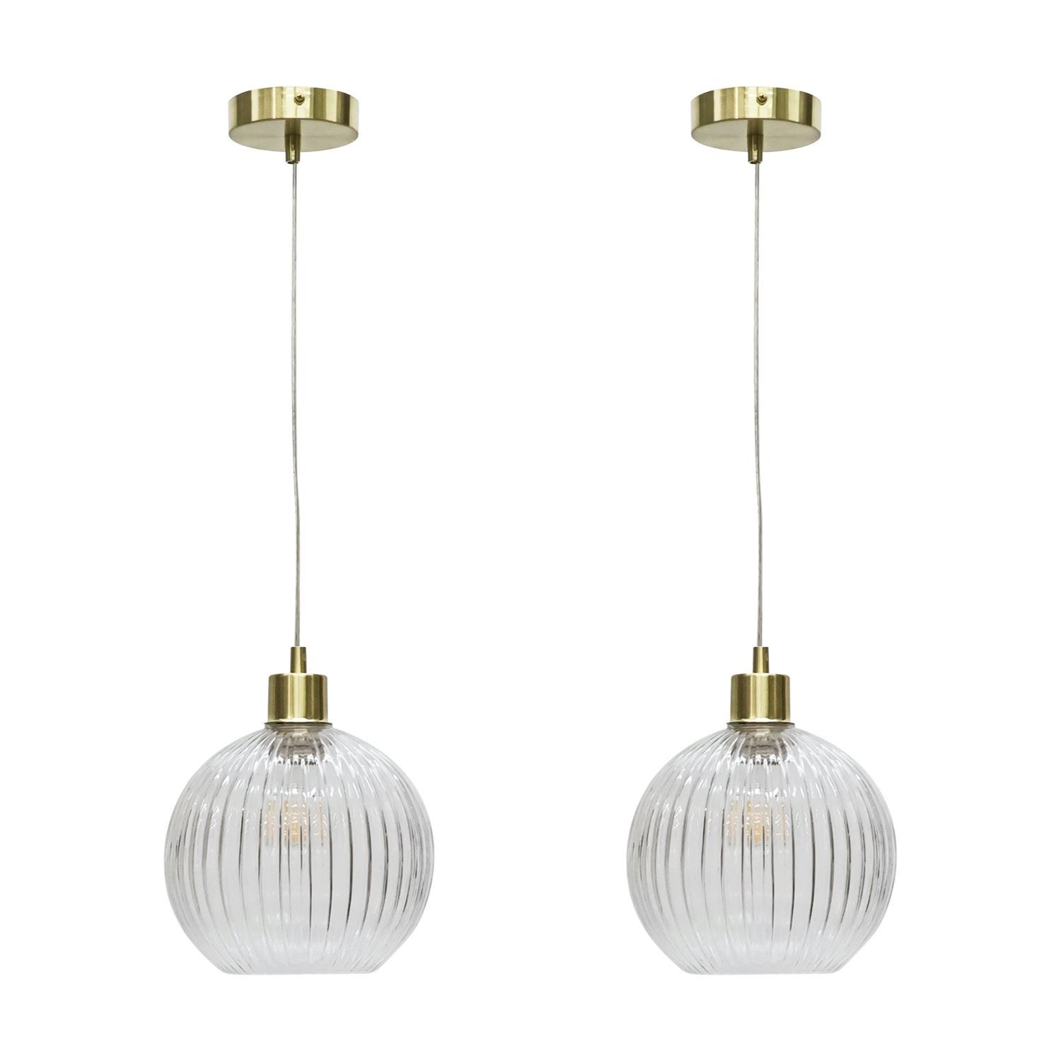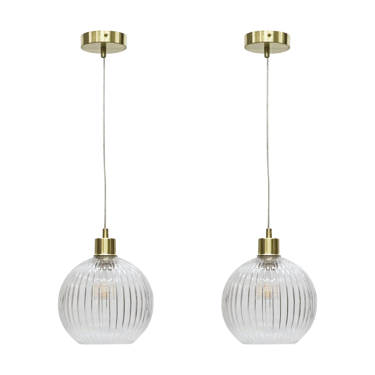 Set of 2 Ribbed Glass Satin Brass Ceiling Light Kitchen Dining Pendant Fittings