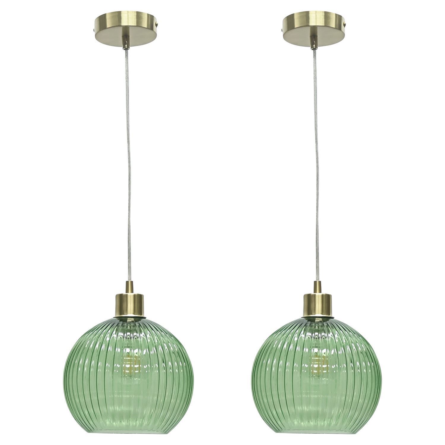Set of 2 Green Glass Satin Brass Ceiling Light Kitchen Dining Pendant Fittings