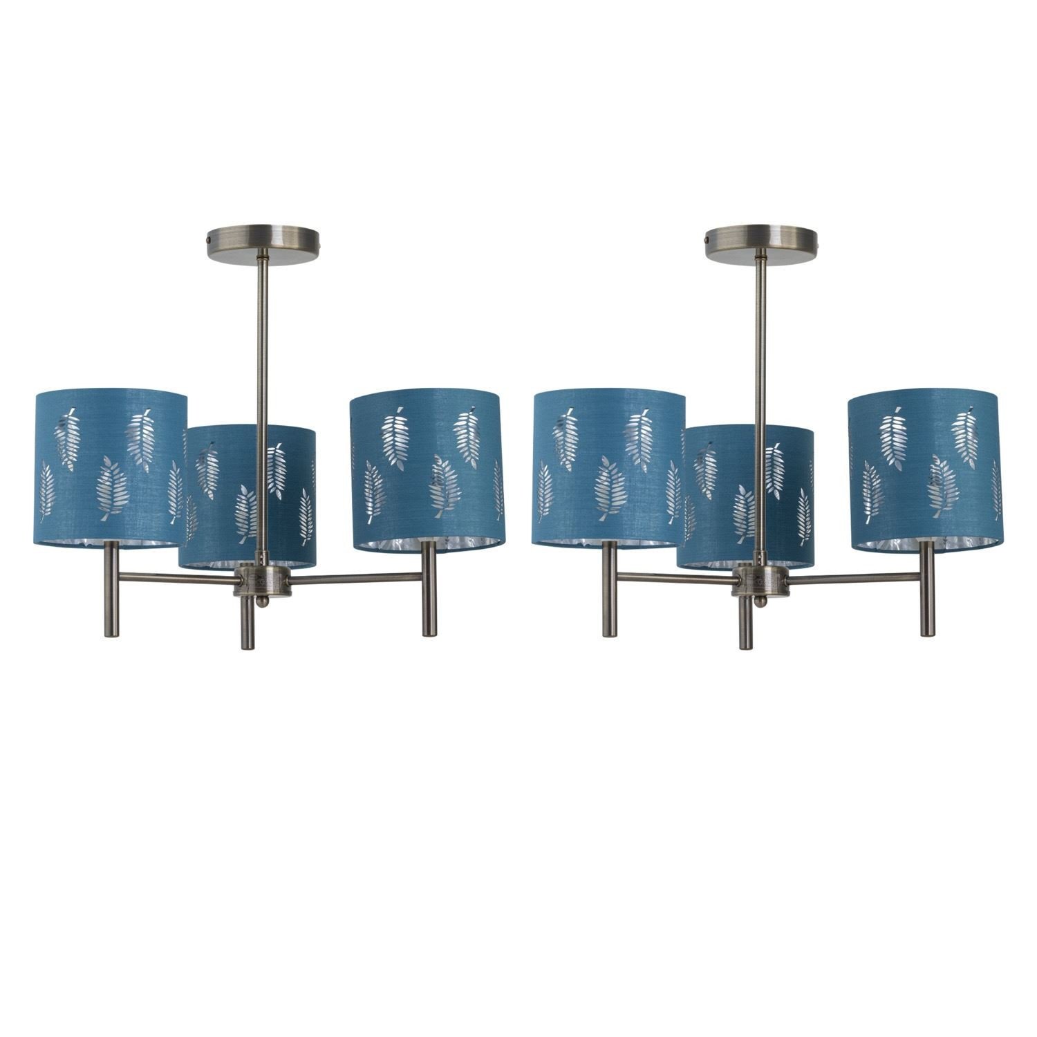 Set of 2 Modern Antique Brass Ceiling Light Fittings with Teal Fern Shades