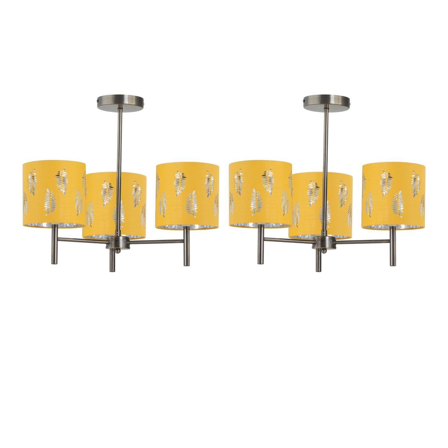 Set of 2 Modern Antique Brass Ceiling Light Fittings with Ochre Fern Shades