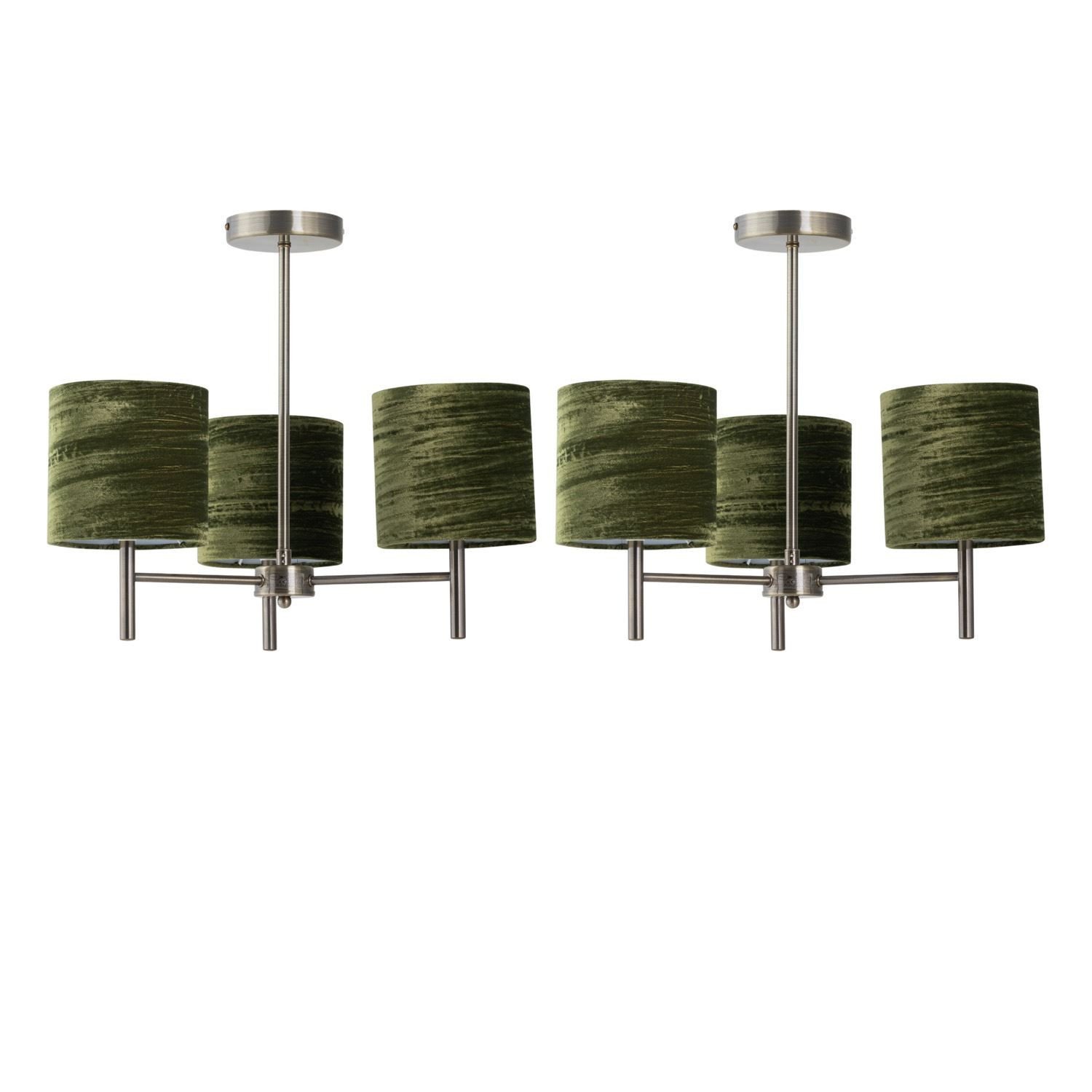 Set of 2 Modern Antique Brass Ceiling Light Fittings Green Crushed Velvet Shades