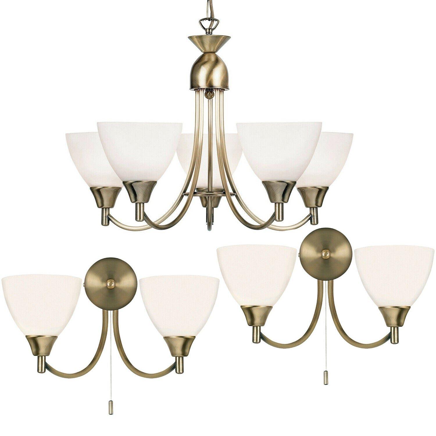 5 Lamp Ceiling & 2x Twin Wall Light Pack Antique Brass Glass Matching Fittings